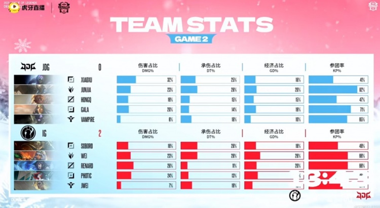 第二局比赛JDG开局打出1换2,但是Wei琪亚娜连续GANK+团战收割早早来到6-0开局!iG也拿下前期的优势+小龙压制!中期iG团战连续获胜,JDG只在厄塔汗团找到机会强杀掉了Wei琪亚娜拿下赏金!但是随即的龙魂团Photic女枪+Renard阿狸双C兜底,HongQ岩雀离谱白给,iG拿下两条大龙扩大经济差,最后的一波团战24层杀人书进场的Renard阿狸不给机会,iG团灭JDG结束比赛,拿到了三个赛点!