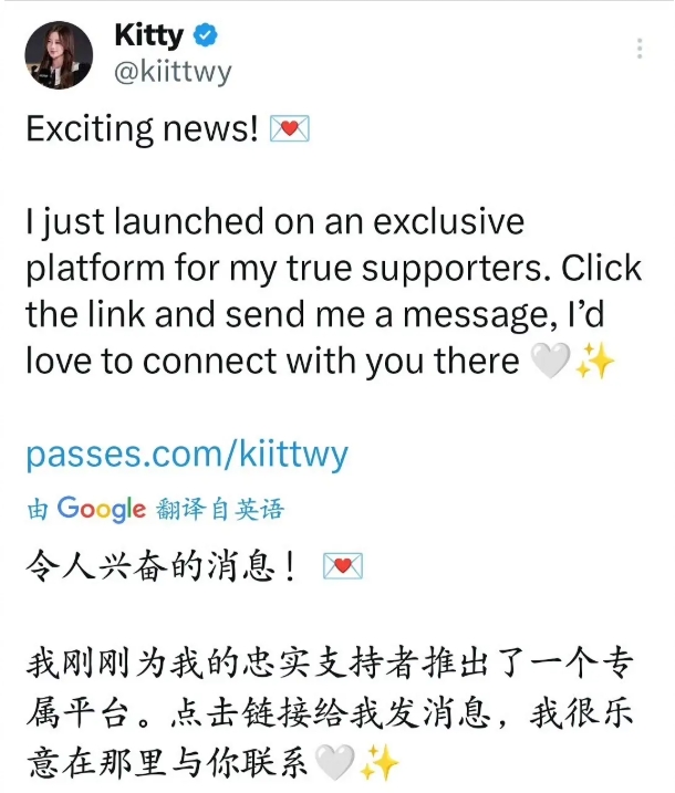 而之后部分网友在得知消息后挖出了Kitty之前的部分黑料,在24年12月Kitty曾在自己的推特宣布开通passes平台账号,并且推出付费图包内容。