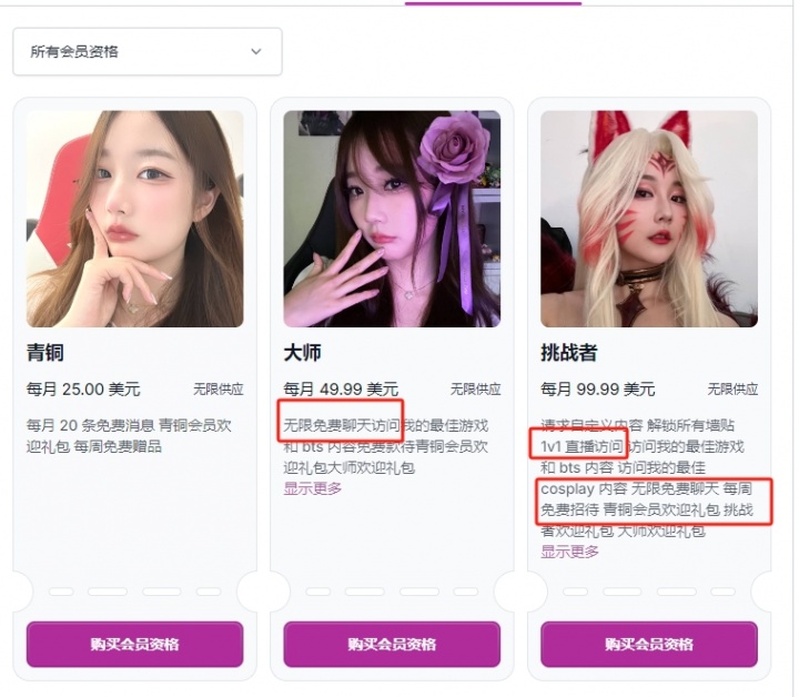 王者会员:每月100美元,无限制发消息,可以随时查看其最新cos内容和专属VIP照片,1v1的直播访问(疑似直播连麦视频,但并无详细说明,存疑)