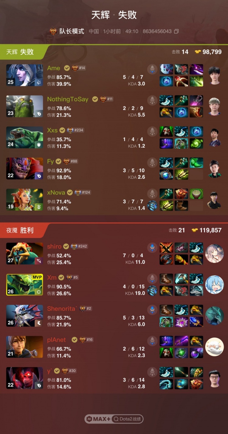 天辉XG:NothingToSay小小、xNova魅惑魔女、Xxs潮汐猎人、Fy莱恩、Ame卓尔游侠