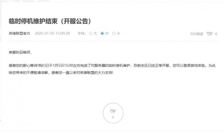 “亲爱的召唤师,感谢您的耐心等待!我们已于1月5日15:00左右完成了对服务器的临时停机维护,目前全区已经正常开服,您可以登录游戏体验。为此给您带来的不便敬请谅解,感谢您一直以来对英雄联盟的大力支持!”