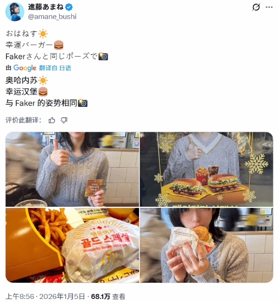 直播吧1月6日讯 近日,日本声优进藤天音在个人社交平台分享了近照,在麦当劳就餐的时候摆出了和《英雄联盟》传奇职业选手Faker一样标志性的动作,并附文:“早上好呀!幸运汉堡!和Faker选手摆一样的姿势!”