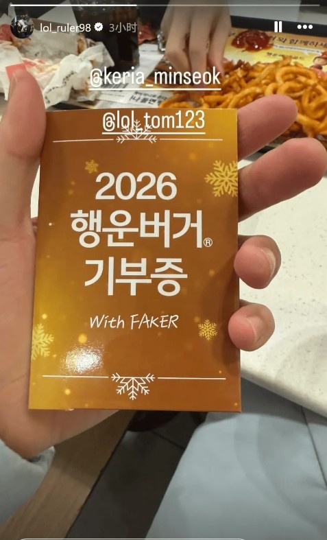 Ruler更新社媒动态,他、Keria和教练Tom三人一起去吃Faker与麦当劳合作的幸运汉堡。