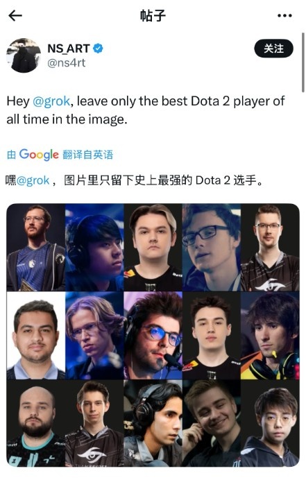 网友问Grok(马斯克的AI),留下你认为历史上最强的Dota2选手…