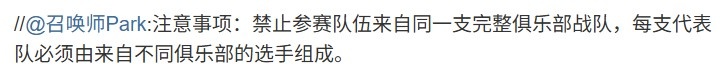 注意事项:禁止参赛队伍来自同一支完整俱乐部战队,每支代表队必须由来自不同俱乐部的选手组成。