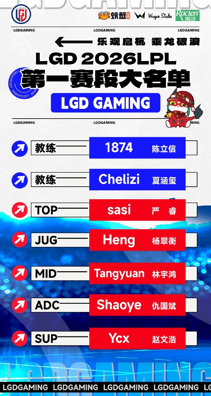 直播吧1月8日讯 LGD公布2026LPL第一赛段大名单&组内赛赛程: