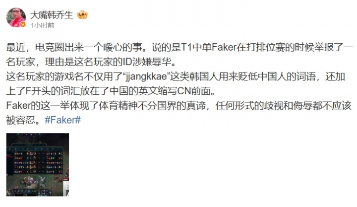 对此央视名嘴韩乔生更博评价:Faker的这一举体现了体育精神不分国界的真谛,任何形式的歧视和侮辱都不应该被容忍。