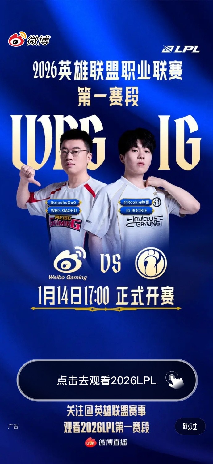 揭幕焦点战!微博开屏显示:LPL1月14日17:00 WBGvsIG