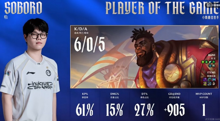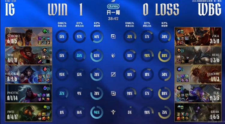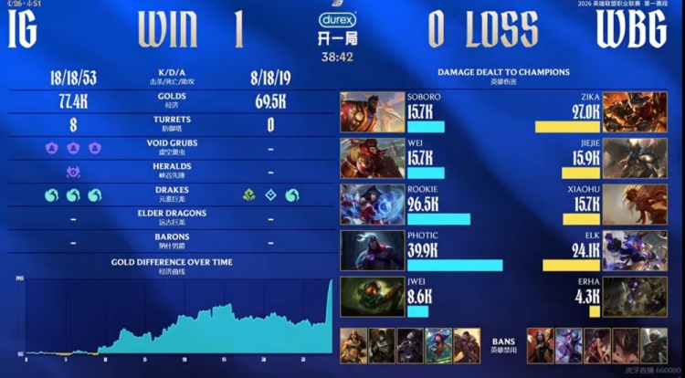 首局比赛WBG先行拿下两条小龙,但iG这边借助中野辅的强开连续拿下击杀,5-0开局!中期iG借助推塔优势拉开经济差,WBG强拿第三条小龙未果陷入劣势局面!iG不急不躁连续拿到三条水龙给足压力,WBG则是强行抗住局势拿下第六条小龙!比赛进入后期,全程发育没人管的Soboro奎桑提20级实在是太能抗了,中路团战就是Soboro找到机会Q3强开+贴脸强杀Elk芸阿娜杀死比赛,iG打出1换5团灭WBG,一波结束首局!