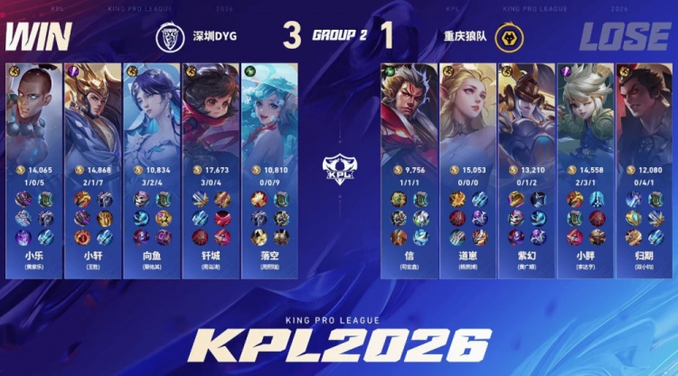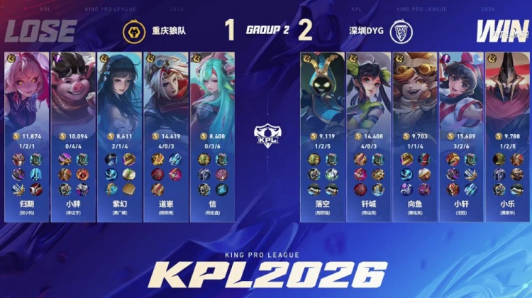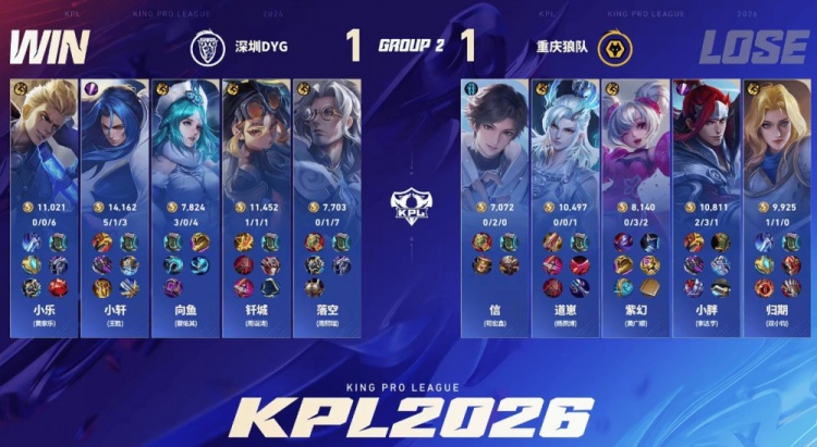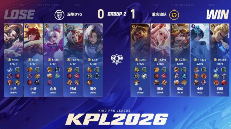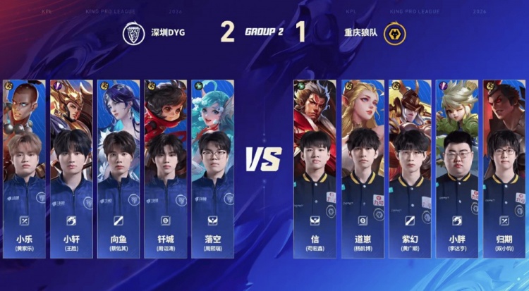直播吧1月14日讯 2026KPL春季赛本场比赛是由重庆狼队对阵到深圳DYG,向鱼面对老东家重庆狼队能否斩获胜利,让我们一起期待!第一局:狼队前期入侵野区成功打开局面,中期大司命接管比赛成功拿下胜利。第二局:DYG前期想要起节奏被狼队反制,但是中期小胖韩信节奏被断,DYG扳平比分第三局:双方前期难分胜负,后期团战狼队无法处理孙尚香的输出,孙尚香拿下三杀帮助DYG拿下胜利第四局:狼队前期建立优势,但是DYG凭借达摩的发挥成功将比赛拖入二十分钟,后期达摩成功破局帮助DYG拿下胜利