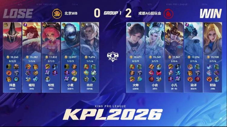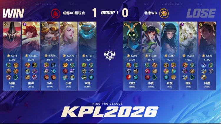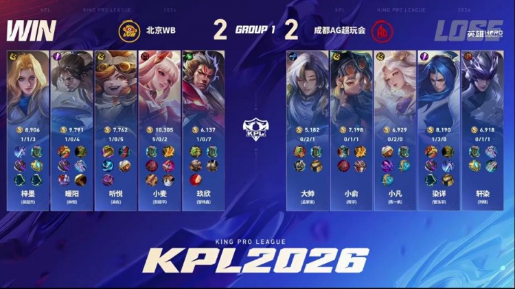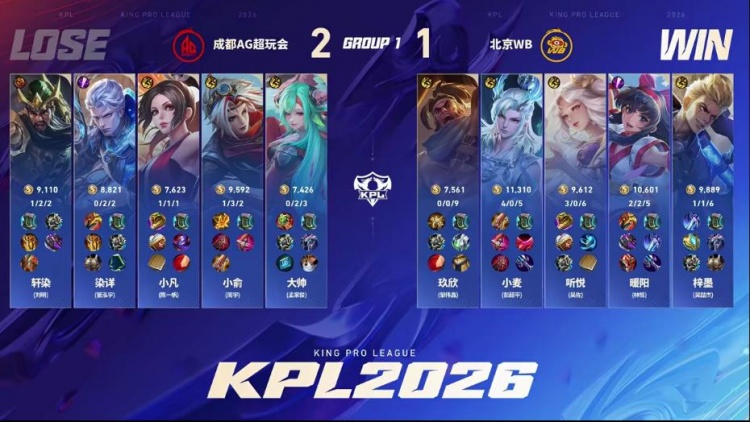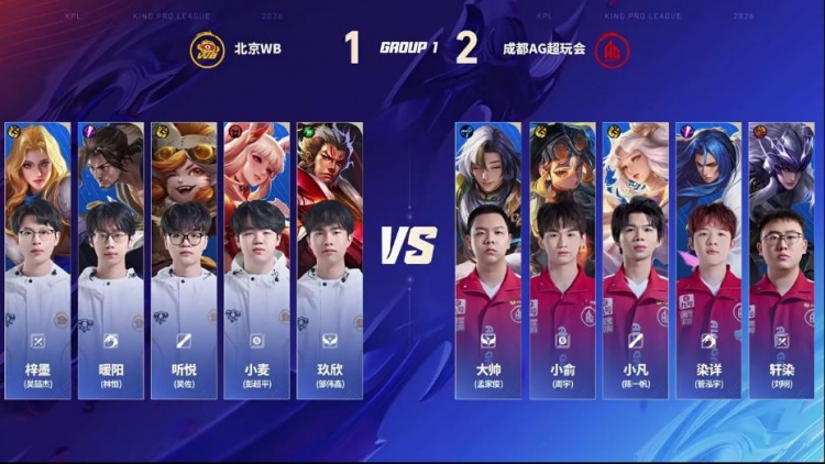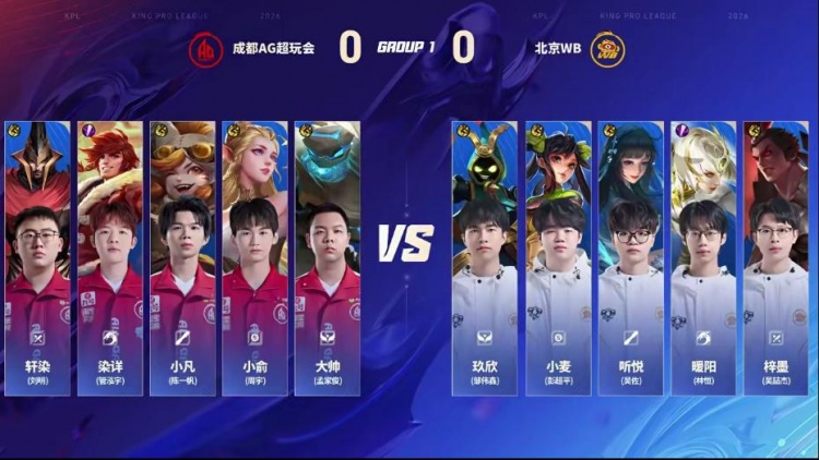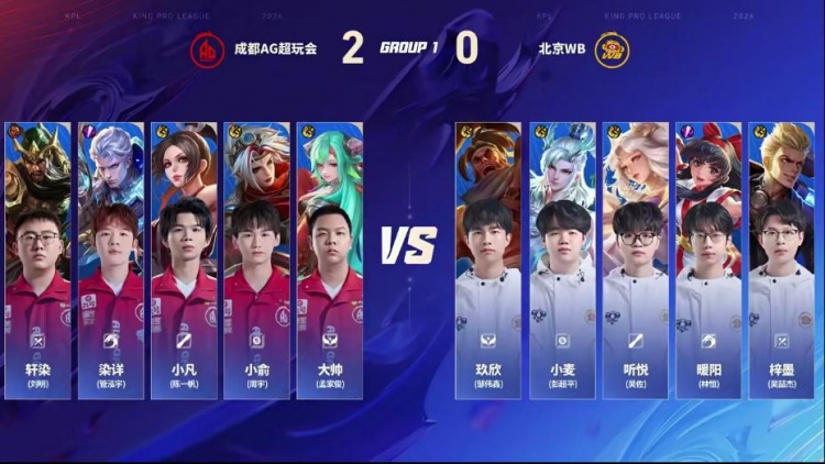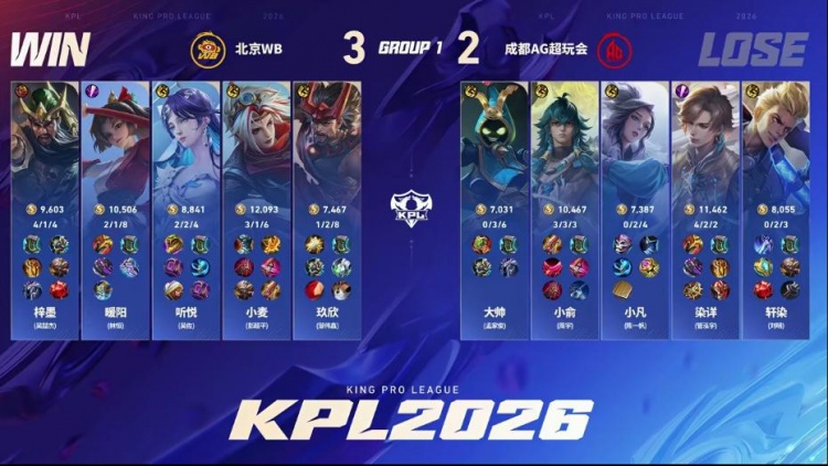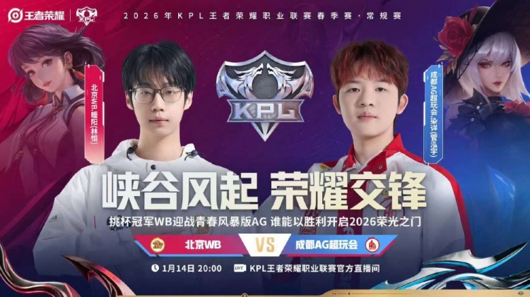 直播吧1月14日讯 2026KPL春季赛本场比赛是由北京WB对阵到成都AG超玩会!大换血的AG面对刚刚斩获挑杯冠军的WB能否打出风采,WB能否斩获2026首胜!第一局:AG前期凭借盾山发挥拆伙成功打出经济压制,后期AG凭借经济压制成功拿下胜利!第二局:双方前期难分胜负,互相抓机会制造掉点,后期AG凭借抓掉点后成功终结比赛拿下胜利。第三局:前期AG多人报团不断打出WB掉点,中期WB凭借苏烈大招强开五人,WB成功拿下优势,后期WB打出持续掉点后推掉水晶拿下胜利!第四局:WB前期控住资源拿下暴君,后期团战WB完美配合打赢团战后成功拿下胜利!第五局:前期WB凭借海月姬强势成功拿下节奏,中期关羽接管比赛成功帮助WB取胜