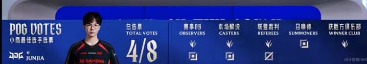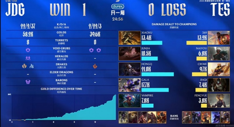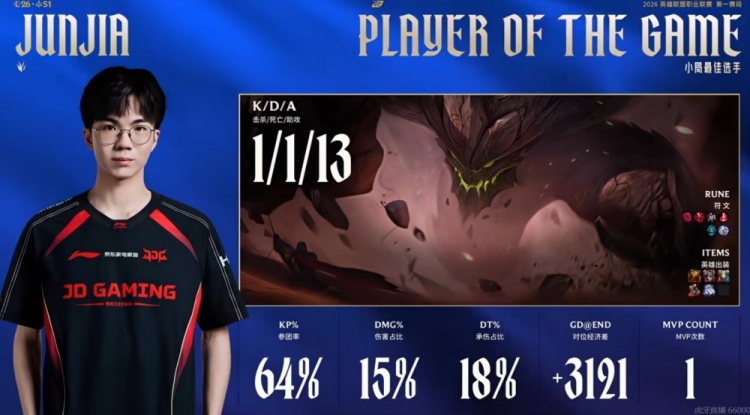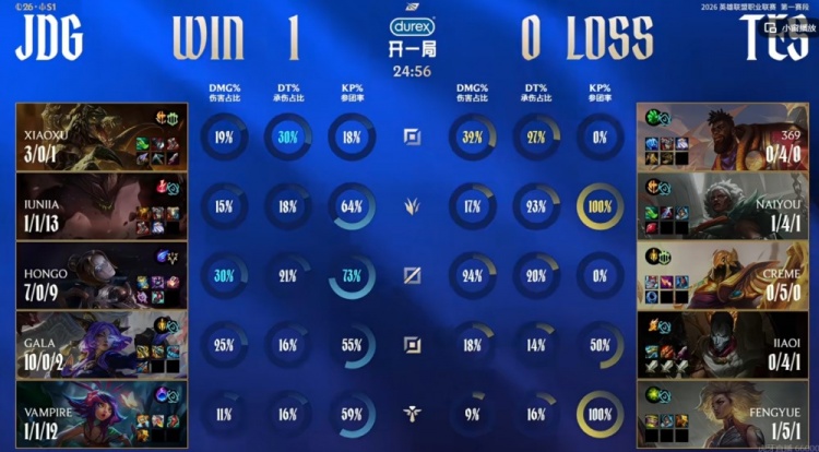 第一局Junjia墨菲特白给但是JDG下路组打出0换2扳回劣势,随后Junjia墨菲特连续和HongQ发条打出配合,连续两次击杀掉了Creme沙皇!中期JDG连续扩大经济优势,xiaoxu鳄鱼还对位单杀掉了369奎桑提!JDG早早拉开一万经济差!野区团战HongQ闪现+金身开秀,JDG拿下大龙之后下路GALA芸阿娜五杀收尾,新赛季第一个五杀!最终Creme沙皇连续被秒,和369奎桑提单局合砍0-9的数据!JDG轻松结束首局的比赛!