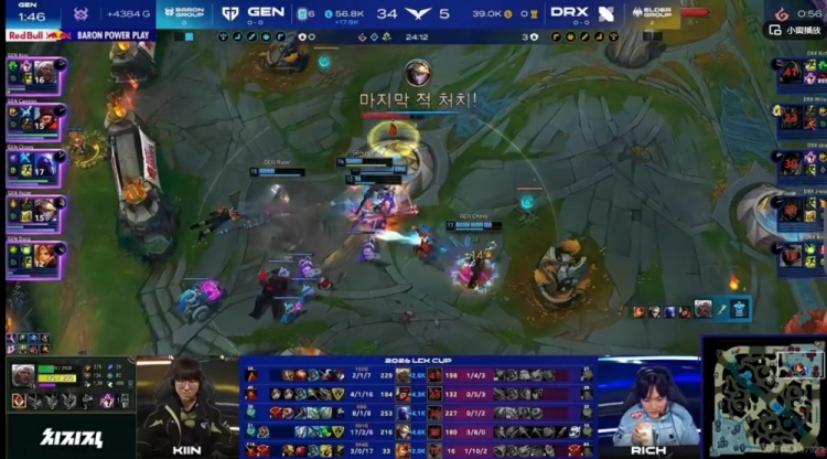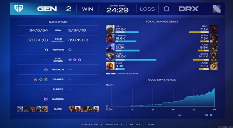 第21分钟Canyon猴子用命开团,GEN双C收割战局团灭DRX,随后Kiin安蓓萨带队上路出击再打一波0换4,GEN回头收下大龙,15000经济差了!随后高地团四件套的Ruler伊泽瑞尔站桩输出,17杀落袋结束比赛!GEN碾压击败DRX!