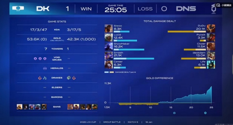 直播吧1月16日讯 2026年LCK杯继续进行中,今天的首场比赛是DK对阵DNS!