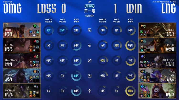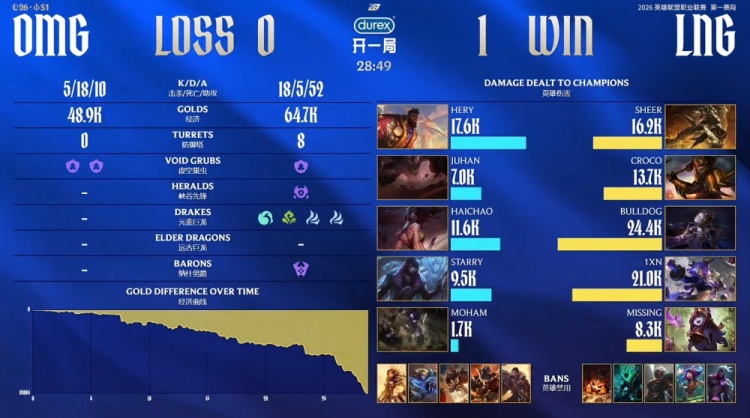 第一局前期下路混战,1xn芸阿娜拉扯配合Croco皇子挑人,LNG打出1换3,经济领先2k。OMG全线崩盘,LNG一路将经济优势扩大至5k。