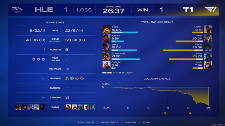 直播吧1月16日讯 2026年LCK杯继续进行中,今天的第二场比赛是焦点对局,T1对阵HLE!!