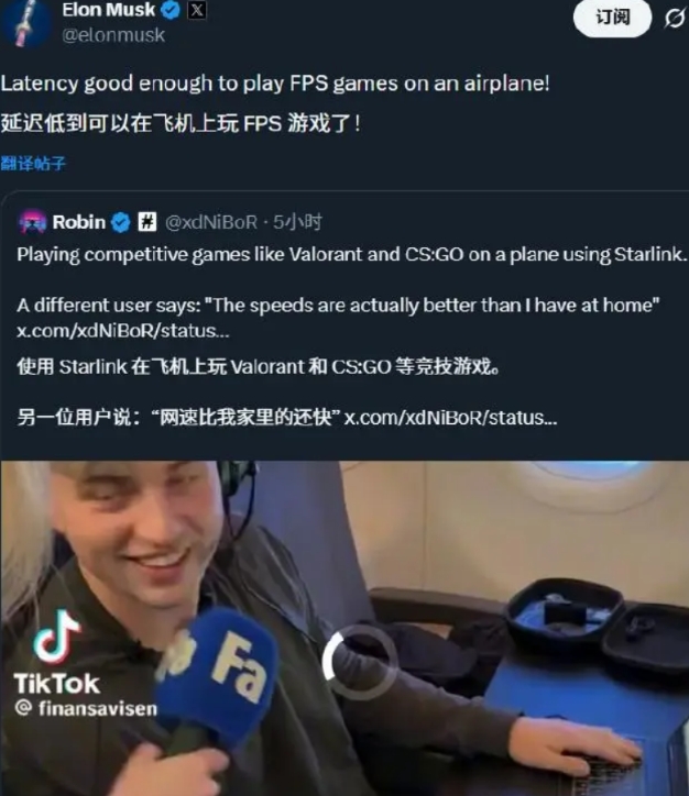 对此马斯克评价道:星链的延迟低到可以在飞机上玩FPS游戏了!