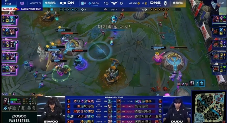 比赛进入中期,DK上中带线+打野补刀压制近60刀,直接滚起3K经济差距!随后中路Lucid赵信后撤步闪R配合下路组双大招强杀deokdam艾希,DK用先锋拆掉对手中路双塔,打出0换3的同时下路单带的Siwoo格温也拆了个塔!这波节奏过后DK直接拿下近7K优势!随后中路又是DK中上收割残局,一波2换4之后拿下大龙,奠定胜局!