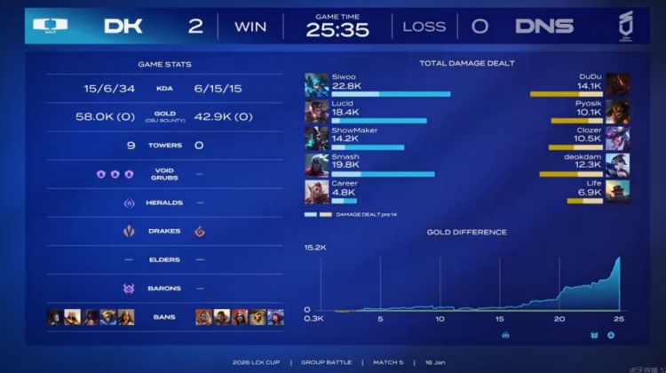 直播吧1月16日讯 2026年LCK杯继续进行中,今天的首场比赛是DK对阵DNS!