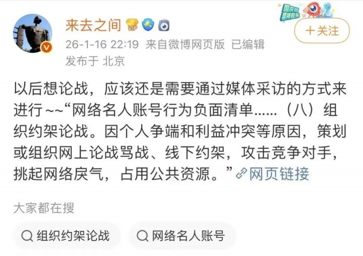 对此,微博CEO王高飞表示:以后想论战,应该还是需要通过媒体采访的方式来进行~~“网络名人账号行为负面清单……(八)组织约架论战。因个人争端和利益冲突等原因,策划或组织网上论战骂战、线下约架,攻击竞争对手,挑起网络戾气,占用公共资源。”