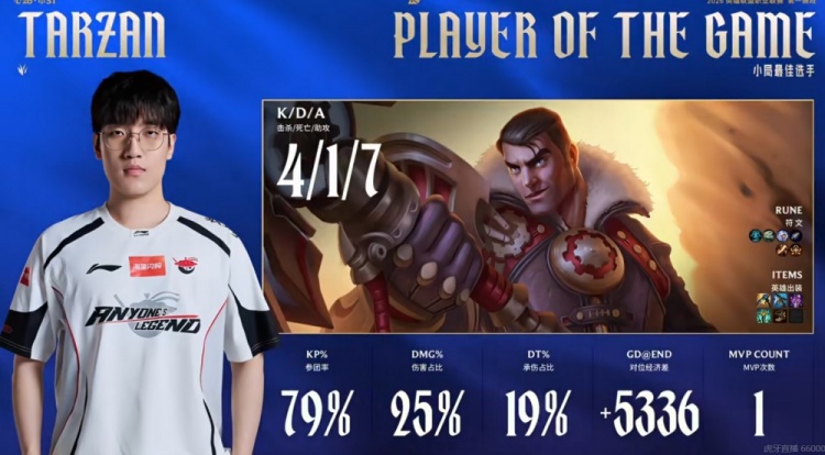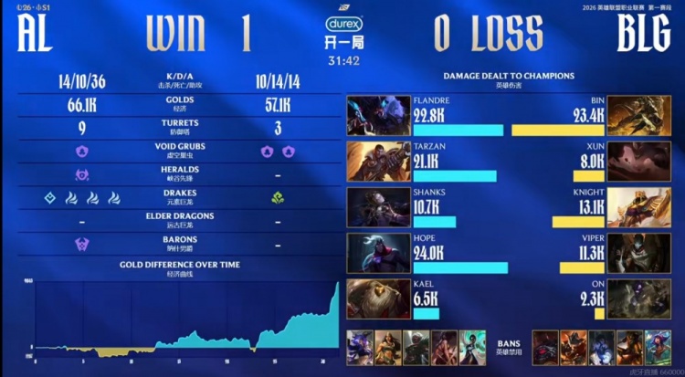 首局比赛Viper+ON下路线杀0换2,同时Bin鳄鱼上路对位单杀Flandre雷克塞也打出对位优势!但是中期AL三poke阵给足了BLG压力,BLG视野受限+中野被压制!关键团BLG在击杀三人的情况下打大龙太慢,被AL还了个0换3之后收下大龙+风龙魂!决胜大龙团AL支援到位反打团灭BLG,Tarzan无解杰斯三杀收尾!AL从上路一波先拿一分!