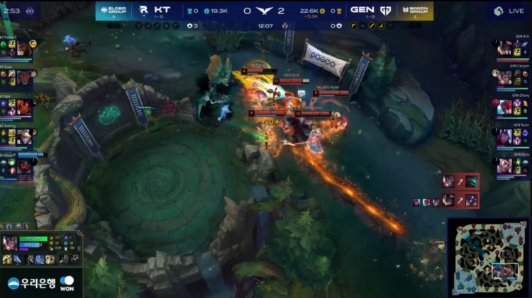 第一局前期,GEN野辅中路游走配合Chovy永恩击杀Bdd岩雀,随后小龙团KT野辅先后开送,GEN打出0换2,经济领先4k。