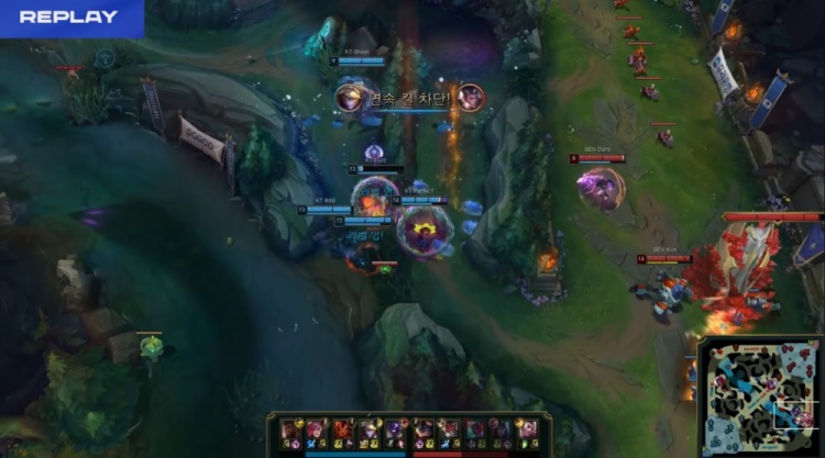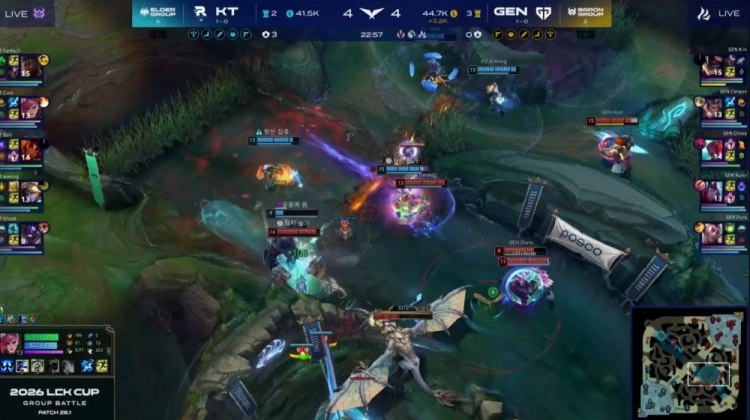 【17:04】Kiin兰博河道绕后烧烤KT四人,后者残血急忙撤退,GEN拿到第三条小龙听牌风龙魂。随后Chovy永恩中路开大越塔想杀bdd未果却被反杀。