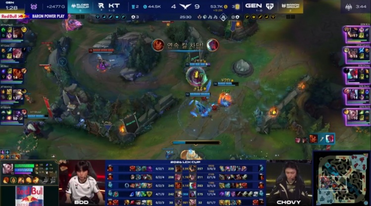 【26:25】Chovy永恩中路带线被KT三人逮捕,GEN四人上路推进打出0换4,GEN经济领先1w1k。