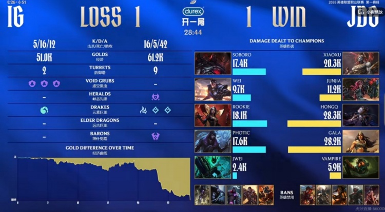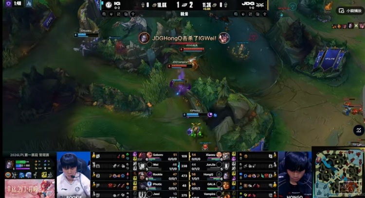 直播吧1月17日讯 2026年LPL第一赛段今天继续,今天的第二场比赛是JDG对阵iG!