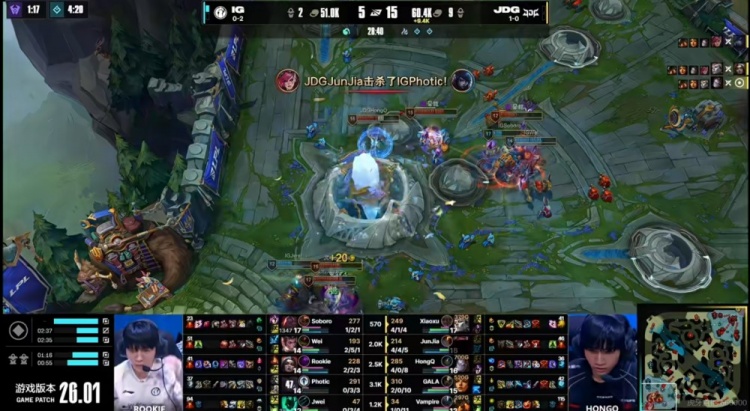 【17:01】Rookie乐芙兰绕后配合队友逮捕Xiaoxu亚恒,但是JDG抱团逼退iG拿下先锋,双方互换一座一塔!