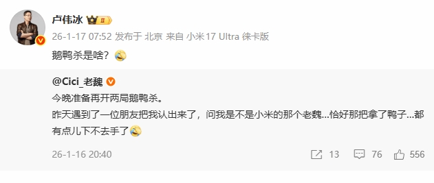 昨日小米集团合伙人、总裁,手机部总裁,小米品牌总经理卢伟冰转发了魏思琪的动态真诚发文:“鹅鸭杀是啥?”