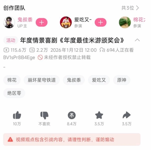 据了解,鬼叔黍于1月12日曾发布视频“年度情景喜剧《年度最佳米游颁奖会》”,该视频后被标记“视频观点包含引战内容,请理性判断,谨防煽动”。疑似视频内容与这次封禁有关。
