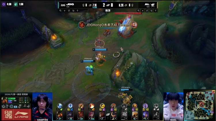 【13:01】JDG入侵AL野区,Kael牛头Q飞JDG三人,JDG中野被杀,AL打出1换2。