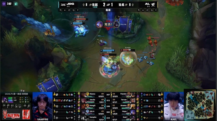【18:40】河道Kael牛头二连击飞Vapimre开团,Vamipre反手钩Tarzan得手配合队友将其融化,上路Kael牛头被Junjia蔚锁头留下人头,JDG经济领先4k。