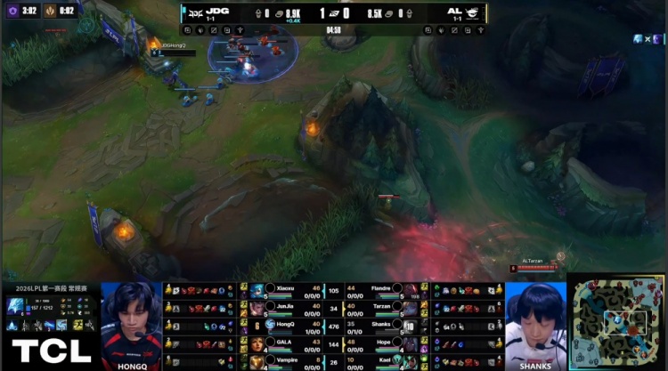 第一局:🎮Junjia铁拳轰轰 Flandre油量见底 V神泰坦钩爆AL JDG赢首局