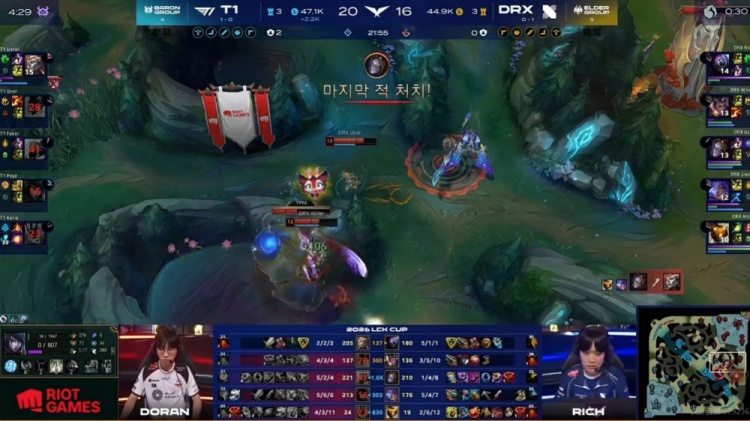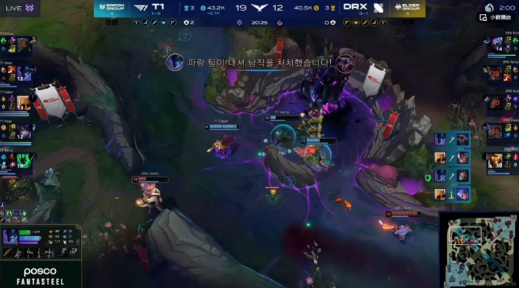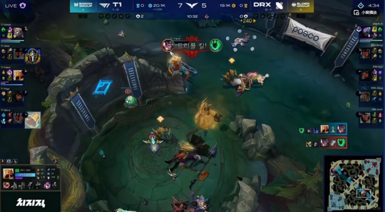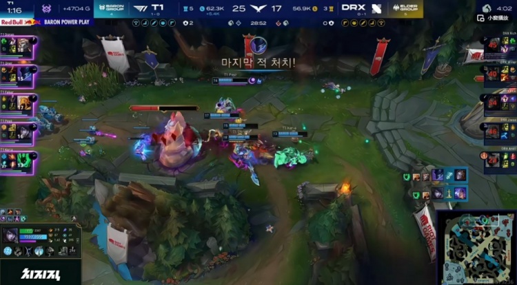 比赛进入中期,19分钟DRX找到机会,先支援多打少分割战局,打出0换3之后开打大龙,但是又想打龙又想打团,结果被Faker沙皇闪现推三个,直接秒俩!T1轻松打出0换4,接盘大龙!不过随即Peyz厄斐琉斯下路白给,T1为了救队友被DRX逐个击破,DRX直接一波0换5团灭T1!双方5K经济差直接被抹平了!