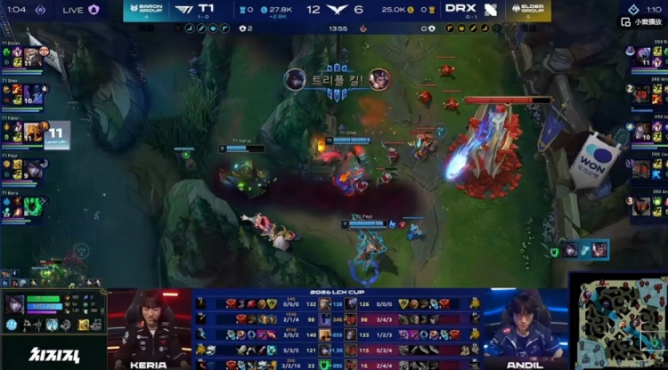 随后DRX想针对Peyz厄斐琉斯,但是Keria锤石一波直接动手,甚至不需要Oner梦魇支援,Peyz厄斐琉斯一波3杀直接让DRX的针对成为无用功!这波节奏过后T1拿下4K经济差!!但是随后DRX多打少击杀T1下野再拿先锋,打回一波!