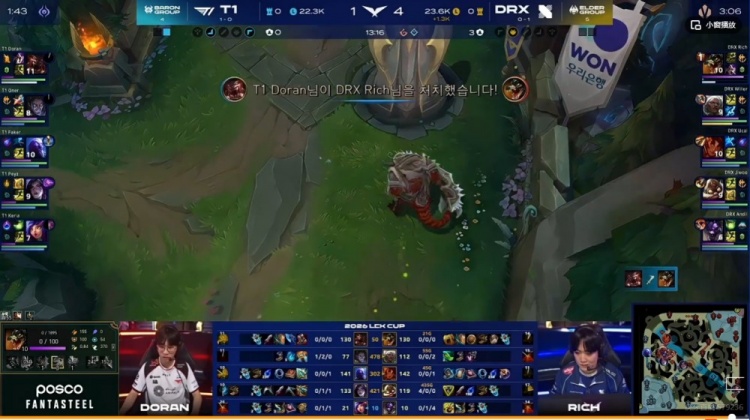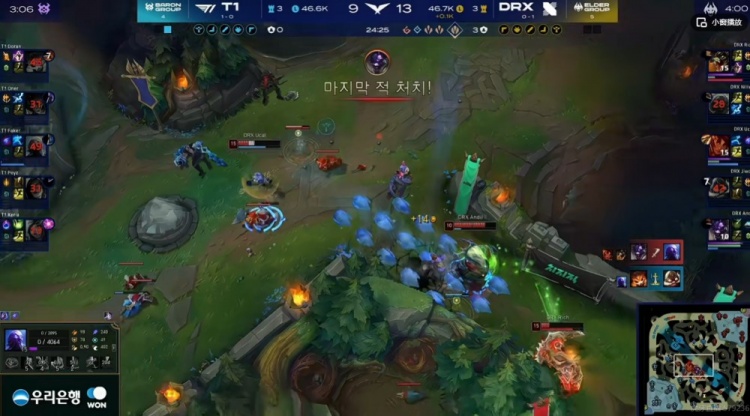 比赛进入中期,17分钟DRX拿下听牌龙,T1借助Doran大纳尔拍三个只留到了Andil牛头!21分钟T1四人看到Willer没在,直接抱团rush大龙,双方打出一波2换2之后DRX换掉土龙魂!24分钟中路团战T1输出明显不够,Keria妮蔻被秒,Doran大纳尔独木难支,结果是DRX团灭T1!