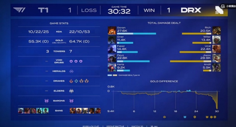28分钟第二条大龙刷新,Oner塞拉斯偷牛头大但是没法进场,DRX拿下大龙之后转远古龙位置!UCAL岩雀关键封路配合队友强杀Faker瑞兹,DRX打出1换3拿下远古龙!随后高地团Faker瑞兹直接被Jiwoo库奇带着远古龙BUFF斩杀,DRX逐个击破,再次团灭T1结束第二局比赛!扳平了比分!
