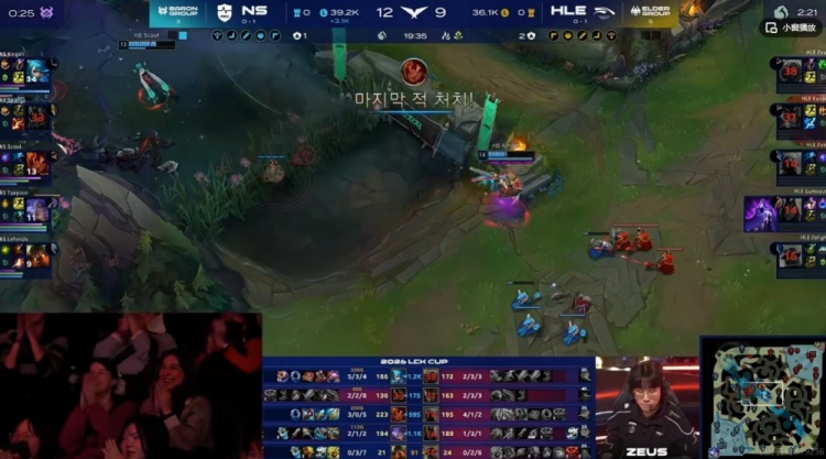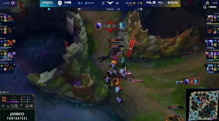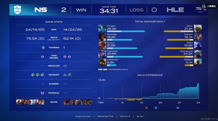 34分钟中路团Lehends泰坦R闪强留Zeka瑞兹,正面Kingen格温还没到NS就依靠装备优势摧毁了HLE!这波NS轻松打出0换4,从中路一波结束比赛!横扫NS拿下首胜!