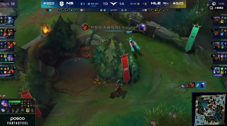 14分钟上路团战NS找到机会,Kingen格温大招拉满输出,同时下路NS强行越塔辅助换AD,这波1换3过后NS又把劣势打了回来了!19分钟HLE交出中辅大招强杀Taeyoon芸阿娜,但是Kingen格温先T先到,落地大招强切维鲁斯拿下双杀,残局少个人的HLE还想打,结果被NS集火逐个击破完成团灭!这波过后NS拉开4K经济差!