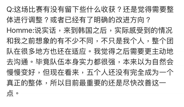而在去年12月时,Homme曾在采访中表示:我时隔很久才回到韩国,整体上仍在适应阶段。这里与在中国时的情况明显不同,和过去我在韩国时的体验也差异很大。不知是否HLE特别如此,但这里的战队体系构建得非常完善,让我能够比较轻松地适应环境。
