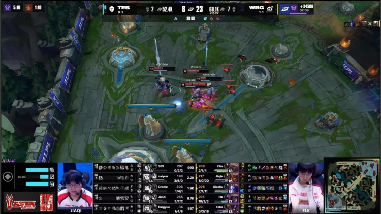 【19:20】JiaQi飞机自家野区被WBG四人逮捕,WBG中路放出先锋撞掉TES一塔。