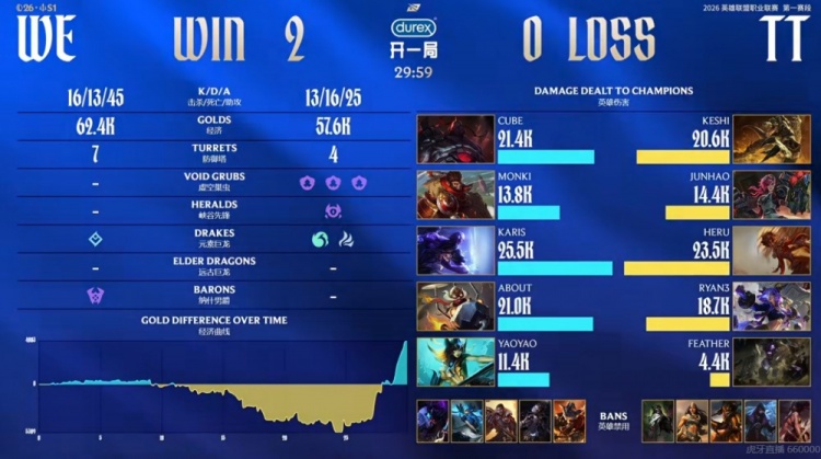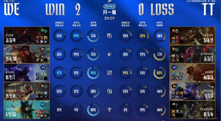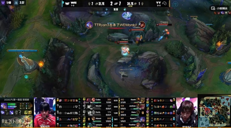 直播吧1月19日讯 2026年LPL第一赛段继续进行中,今天的首场比赛是WE对阵TT!