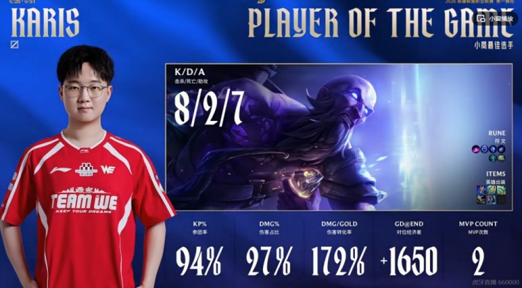 第一局:🎮Karis塞拉斯团战爽偷大招 About维鲁斯持续输出拉满 WE赢首局