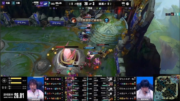 中期小龙团knight阿卡丽进场先斩Rookie辛德拉再杀Wei奇亚娜,Soboro河道亚恒反手双杀,双方经济持平。紧接着knight阿卡丽上路单杀Rookie,BLG赢下两波小龙团,经济优势一路来到4k。