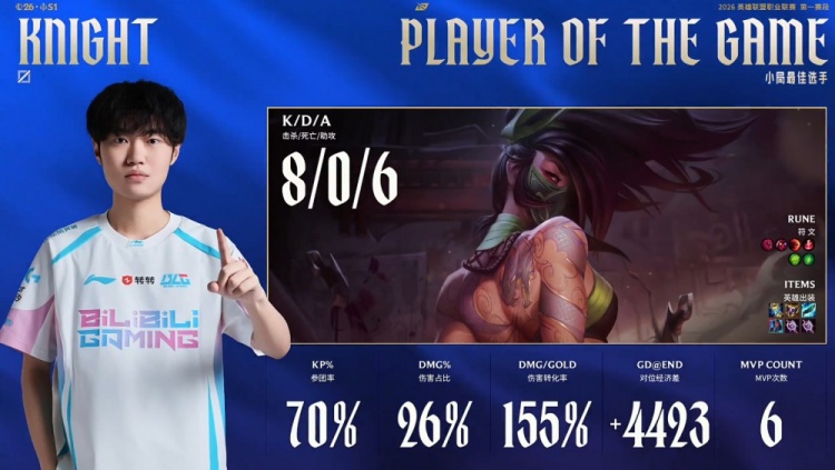 【25:49】knight阿卡丽上路轻松再次单杀Soboro亚恒,战绩来到7-0-2。BLG经济领先6k。