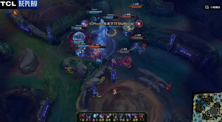【13:20】下路Photic芸阿娜+Jwei璐璐线杀盲目开大的Fengyue妮蔻,回头Creme瑞兹开车支援但是有璐璐大加持的Photic芸阿娜还反手击杀掉了JiaQi卡莎!这波0换2打完iG领先2K多了!