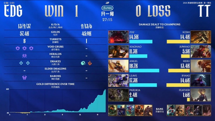 中期大龙团,Xiaohao皇子爆斩双杀,EDG打出0换2吃掉大龙,经济领先4k。随后Heru岩雀主动封路开战,TT反遭EDG打出0换2,EDG经济优势逐步来到8k。