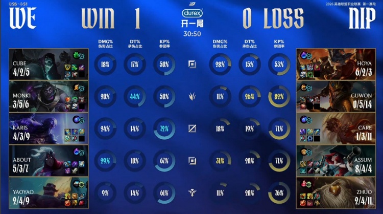 第一局前期巢虫团,About韦鲁斯TP来正面落地成盒,Assum女枪轰出三杀,NIP打出1换4。紧接着WE入侵NIP野区又被打出1换4,Guwon皇子扣两人让Assum女枪扫满大招,Assum战绩来到5-0-2,NIP经济领先3k。